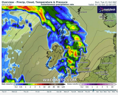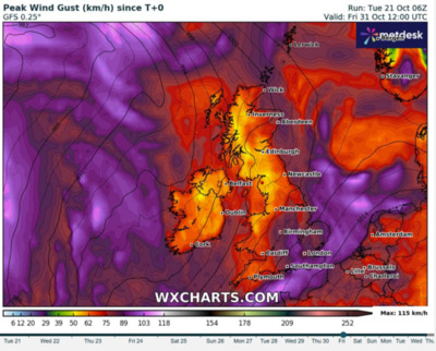 Britain is set to be battered by fierce autumn weather as powerful Atlantic winds and heavy rain sweep across the country at the end of October. Weather maps from WXCharts show that by Friday, October 31, the UK will be gripped by gusts of up to 71mph and widespread downpours, with forecasters warning of potential disruption through the Halloween weekend.